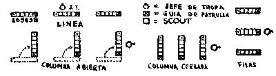 Columna cerrada. Las patrullas de atrás se mueven hasta quedar en línea con las de enfrente, para ocupar menos lugar cuando desfilan, o cuando alguien les va a dirigir la palabra. Se puede formar en línea de "Columna abierta", hacia la derecha o hacia la izquierda, dando las patrullas media vuelta de ese lado, o al frente, parándose la patrulla que va guiando, la segunda patrulla inclinándose y moviéndose hacia la derecha, la tercera moviéndose hacia la izquierda y siguiendo en esa forma las patrullas posteriores, las pares a la derecha y las nones a la izquierda de la patrulla que guía. Las patrullas al moverse, siempre lo hacen al trote. La línea se puede formar detrás partiendo de "columna abierta", ordenando a todos media vuelta (ésta deberá darse siempre a la derecha) y procediendo en seguida como anteriormente, para formar la línea. Formación con señales de brazos Con una Tropa lista, esta clase de formaciones pueden llevarse a cabo fácilmente sin tener que dar voces de mando; todo lo que se necesita es que el Jefe de Tropa haga una señal e, inmediatamente, todos los Scouts trotan a ocupar sus puestos en su patrulla, todos de frente al Jefe de Tropa. Por