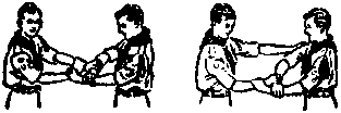 (d) Dos palos largos pasados por dentro de dos costales a través de dos agujeros hechos en las esquinas del fondo. Al llevar a un paciente en una camilla, tened cuidado de colocarlo lo más cómodo que os sea posible, antes de principiar a caminar. Los dos camilleros deberán levantar la camilla al mismo tiempo; deberán caminar con pasos cortos y encontrados. El camillero trasero observará cuidadosamente al paciente. Si los palos son cortos serán necesarios cuatro camilleros, uno para cada extremo de la camilla. PRÁCTICAS DE PATRULLAS EN PRIMEROS AUXILIOS El adiestramiento en Primeros Auxilios debe ser muy completo, ya que el público espera mucho de los Scouts. Preparad "accidentes" de sorpresa para las juntas de patrulla o de Tropa, haciendo que se encarguen de ellos diferentes Scouts. En los momentos disponibles, practicad lo Siguiente: improvisación de camillas, Sillas de manos, la respiración artificial, improvisación de tablillas para miembros lesionados. JUEGOS DE PRIMEROS AUXILIOS Misioneros Por turno, todos los Scouts harán de exploradores o misioneros, con unos cuantos remedios sencillos. A cada uno le serán presentados, uno después de otro, tres enfermos con diferentes lesiones o enfermedades. El Scout tendrá que dar o aconsejar el tratamiento adecuado.Prisioneros heridos Colocados a 50 metros en diferentes puntos del campamento, hay tantos prisioneros como competidores en el juego. Cada uno de los prisioneros tiene, prendida a la camisa, una etiqueto en que se describe una lesión. A una señal, los competidores correrán al lado de un prisionero, le prestarán los primeros auxilios que requiera y lo traerán al campamento. El primero en llegar con su prisionero debidamente atendido es el que gana. Exhibiciones Las exhibiciones de salvamento de vidas gustan mucho, tanto a los ejecutantes, como a los observadores. Accidente de bicicleta. - Unos muchachos regresan de un campamento. Un ciclista temerario. Una desgracia. Curación de heridas y transporte de pacientes al hospital en camillas improvisadas. Exploción de gas. - La señora Coddles y su familia salen de paseo. Al regreso se encuentra con una amiga. Manda a María que se vaya a casa, encienda la estufa y prepare el té de su padre. Éste regresa de su trabajo y encuentra la casa llena de gas. Viene una ambulancia. Arrastran a María fuera de la casa y le dan respiración artificial. El policía Ado aparece en escena. iCómo no había de buscar la fuga de gas! Trágico fin de un policía valiente, pero irreflexivo. Exhibición de incendios.- Noche, en el No. 5 del suburbio Villas. Se oye la señal de alarma. Se avisa a los moradores. Se forma valla para contener a la gente. Llegada de los bomberos trayendo mantas para recibir a los que salten por las ventanas, y también cuerdas y escaleras. Salvamento de los que aún queden en la casa incendiada. Incendio en una fábrica. - Encontrándose los obreros dedicados a sus labores cotidianas, ocurre una explosión que ocasiona un incendio dentro del edificio y el derrumbe de una pared exterior que lesiona a un hombre que pasaba por allí. Los obreros ilesos atienden a sus compañeros menos afortunados, mientras otros corren en busca de socorros, regresando con una ambulancia y con los extinguidotes de incendios. Algunos hombres son rescatados del edificio incendiado saltando desde la torre y siendo recibidos en la manta. |