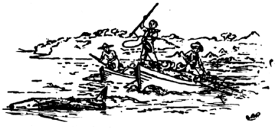 ballena Dos canoas, cada una tripulada por una patrulla, toman generalmente parte en la pesca. El Guía hace las veces de capitán, el Sub-Guía de arponero, los demás reman. Cada canoa estará en un puerto, distante entre sí un kilómetro, aproximadamente. El árbitro coloca la ballena a igual distancia de ambos puertos, y a una señal las dos canoas salen a fuerza de remo, para alcanzar al animal. El primer arponero que llegue cerca de la ballena lanza su arma y el barco se retira arrastrando la presa. El segundo barco los persigue, arponea en cuanto puede, e intenta llevarse también la ballena. Para terminar, los más fuertes se la llevan y, a veces hasta el barco contrario. (Este