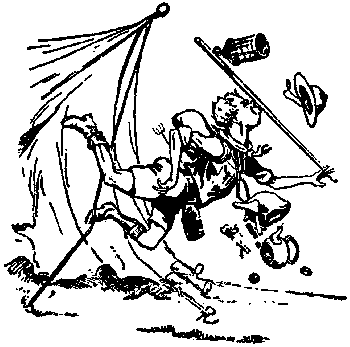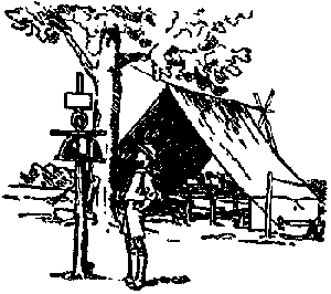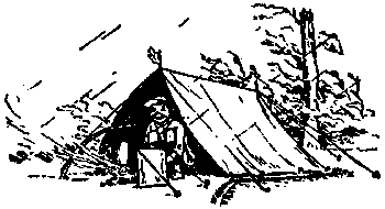 Un viejo Scout cuenta con multitud de recursos. Siempre encuentra cómo salir de cualquier dificultad o incomodidad. Terreno Cuando se va de campamento, lo primero que hay que hacer es decidir el lugar en que se va a establecer y qué clase de campamento va a ser. Mientras más cerca se encuentre de vuestras casas, menos serán los gastos de viaje. Para mí, el mejor lugar para un campamento es cerca de un bosque, donde le den a uno permiso de cortar leña y construir chozas. Por tanto, si sabéis de algún vecino que os quiera prestar un rincón de su bosque, he aquí vuestra oportunidad. Hay que recordar que en los bosques el suelo es húmedo y que los árboles siguen goteando durante algún tiempo después que ha cesado la lluvia. Si encontráis una choza impermeable, ya no tendréis necesidad de tienda. La villa del mar también proporciona buenos terrenos para acampar, siempre y cuando haya manera de conseguir botes y un lugar para nadar. Alguna vez podréis conseguir una caseta de botes en que vivir, pero no olvidéis que hay necesidad de contar con agua potable y leña. También podréis ir a las montañas, páramos o ríos, y conseguir permiso de construir ahí vuestro campamento. Al escoger el sitio para el campamento hay que pensar en lo que será éste en caso de que el tiempo se vuelva lluvioso y ventoso. Escoged, pues, el lugar más seco y más abrigado, a la vez que el más cercano al agua. Recordad que una buena fuente de agua es de la mayor importancia y aseguraos de que el agua para beber sea potable.Campamentos volantes Muchos Scouts prefieren un campamento ambulante a uno fijo o permanente. Por supuesto que es más divertido el campamento ambulante que el permanente, pues se goza del constante cambio de paisaje, pero para esto se necesita contar con buen tiempo. Al proyectar vuestra excursión, lo primero que debéis hacer es seleccionar la parte del país que vais a recorrer, marcando en el mapa los lugares donde vais a pernoctar. Encontraréis que más o menos ocho kilómetros son los que podréis caminar diariamente. Quizá os conviniera construiros un carromato para llevar vuestra tienda, mantas, sábanas, impermeables, etc. Al final de cada día tendréis que conseguir permiso de algún granjero para levantar vuestra tienda en su terreno, o para dormir en su granero, especialmente si el tiempo es lluvioso. Carpas o tiendas de campaña Antes de decidir sobre la tienda que vais a adquirir, tendréis que pensar sobre si la vais a utilizar en un campamento fijo o en uno ambulante. Para campamento permanente prefiero la que usan los exploradores, llamada tienda de caballete o de paredes. Es la mejor respecto a comodidad y para hacer que el campamento se vea arreglado. Si tiene sobre-toldo, será realmente impermeable, aún en caso de que toque uno el techo por dentro; además, aquél la conservará fresca bajo un sol ardiente, y caliente en tiempo de frío. Las