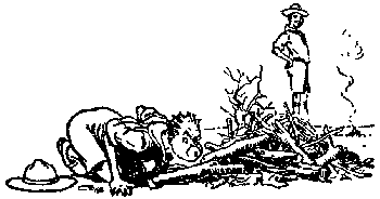 Para poner fuego a todo esto, hay que colocar la cerilla debajo de la yesca. Cuando la madera ya ha cogido fuego hay que agregar más palos largos y finalmente leños. Un Pie Tierno, después de encender el fuego, apagará su fósforo y lo dejará caer al suelo. Un experto lo doblara en dos antes de tirarlo al suelo. ¿Por qué? Porque si la cerilla no está realmente apagada sino sólo en apariencia se lo dará a conocer quemándole la mano. |