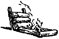 Lo mejor en una fogata para cocinar es conseguir formar un montón de ascuas, las cuales pueden quedar en el centro de tres leños colocados radialmente, como los rayos de una rueda. Este fuego nunca se extingue, pues basta ir empujando los leños hacia el centro, para conseguir nuevas ascuas. En esta forma se obtiene un fuego que apenas levanta llama y que no hace humo. Si deseáis que el fuego permanezca ardiendo durante la noche, para obtener luz o calor, construid la fogata en estrella, con uno de los leños al alcance de vuestra mano, para que podáis empujarlo de cuando en cuando hacia el centro, sin tener que levantaros a atizar. |