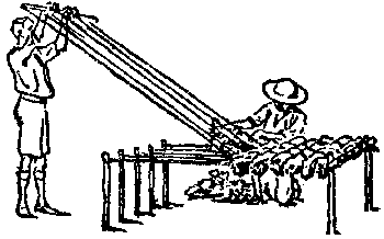mientras otro va colocando sobre las cuerdas horizontales manojos de