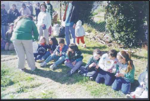 El clan de Pioneros "Juan Salvador Gaviota" en una actividad de servicio en el barrio del Cerro de Montevideo en 1999