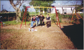 Los Rovers del equipo Antorcha, descansan un poquito después de haber pintado los juegos de la escuela "Canada", en su primer servicio en mayo del 2001 |