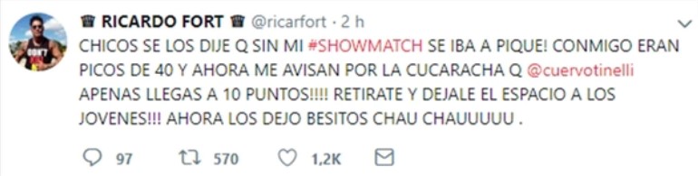 Quien haya escrito en lugar de Fort remató el mensaje pidiendo a Tinelli que se retire y dé lugar a los jóvenes. "Ahora los dejo. Besos, chau, chauuuuu".