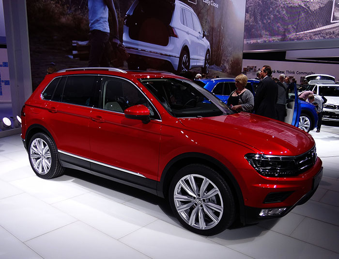 Volkswagen Tiguan: la segunda generación del utilitario deportivo medio de Volkswagen pasa a adoptar la plataforma modular MQB, para motores transversales, la misma del hatch Golf y del sedán Audi A3. Por eso el SUV está 50 kg más liviano que el antecesor. Los motores disponibles en Europa van de 115 cv a 240 cv. Volkswagen exhibió también una versión-concepto GTE del Tiguan. Se trata de un plug-in hybrid drive con 218 cv de potencia y tracción integral.