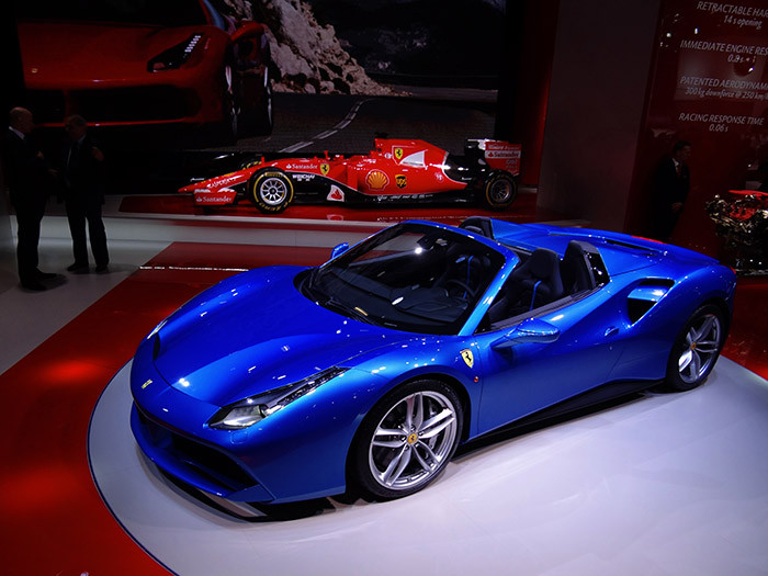 Ferrari 488 Spider: Ferrari asegura que el 488 Spider es el convertible más poderoso jamás construido. Es impulsado por un V8 biturbo central-trasero de 3.9 litros de 670 cv y 77,5 kgfm de torque (el mismo utilizado en la 488 GTB). Con una potencia específica impresionante (172 cv/litro), el superdeportivo va de 0 a 100 km/h en 3 segundos y alcanza los 200 km/h desde el arranque en 8,7 segundos. En parte ese desempeño se debe al bajo peso total: apenas 1420 kg. El cupé-cabriolet tiene techo rígido retráctil de vidrio y fibra de carbono de tamaño reducido, lo que lo hace 25 kg más liviano que si fuese hecho en lona con armazón de metal. Se cierra totalmente en 14 segundos. El modelo además utiliza 11 tipos de aluminios diferentes en su construcción.