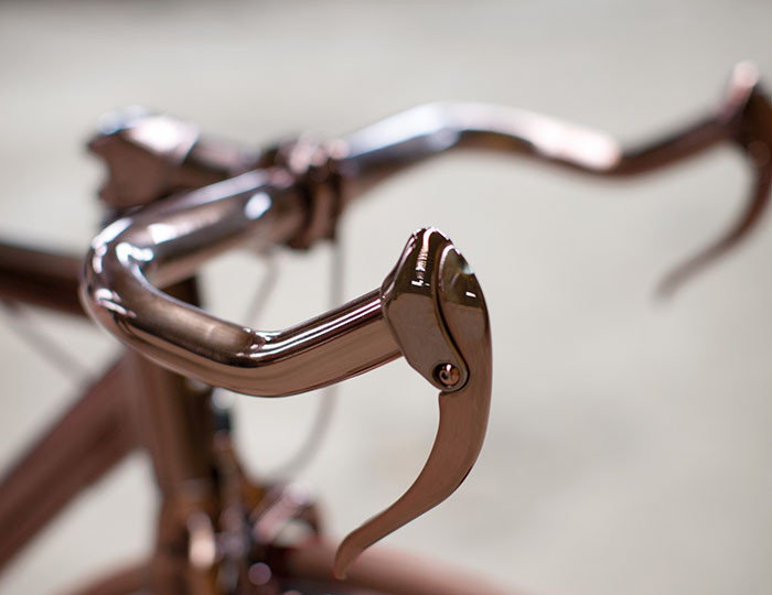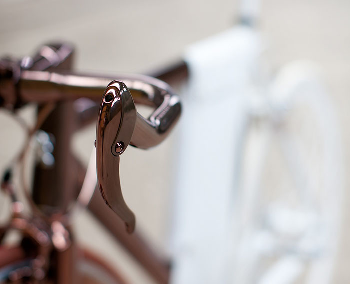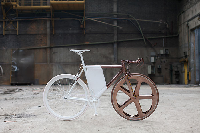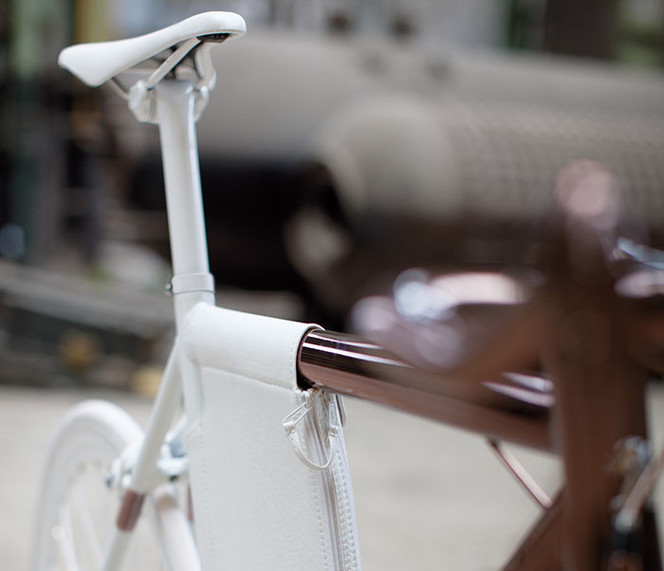 "La bicicleta DL121 es un ejercicio de investigación gráfica, material y de colores, que se sitúa en la frontera entre el arte y la funcionalidad. Diseñada por el propio director técnico del Peugeot Design Lab, Cathal Loughnane, aprovecha la separación dinámica diagonal existente entre las dos mitades de la bicicleta. En la parte delantera, el aluminio y el carbono simulan un cobre profundo y rico, mientras que la parte trasera ha sido revestida de un cuero blanco diamante puro y limpio", explica el comunicado de la marca.