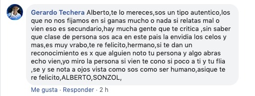 Gerardo! El mundo necesita más gente como vos. Personas que le dan para adelante a otras, sin envídia y siempre queriendo que al otro le vaya bien. Te felicitamos de corazón, gracias por pasar por nuestra sección. En forma de agradecimiento queremos hacerte un pequeño regalo, pasanos tu dirección por interno que te haremos llegar un lindo pañuelo. Así te podés limpiar un toque la comisura de la boca. Tenés algo ahí. Vamos arriba Gerardo! Sos groso! Te merecés lo mejor! K-po!