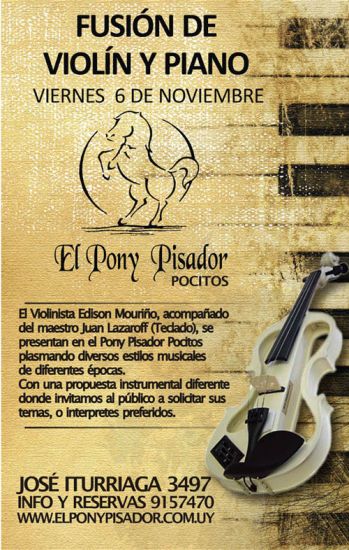 Los viernes 6 y 27 de noviembre, en El Pony Pisadror de Pocitos, fusion de violin y piano con Edison Mouriño (violin) Juan Lazaroff (piano). Info y reservas al 915 74 70 El Pony Pisador Pocitos, Ituriaga 3497