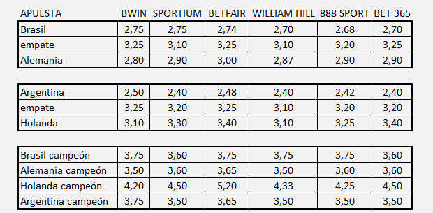 Una vez confirmada la lesión que sacó a Neymar del campeonato, los norteños dejaron de ser los candidatos de Bwin, Sportium, Betfair, William Hill, 888 Sport y Bet 365. Ahora, el que paga menos es el combinado argentino, aunque en algunos casos tiene el mismo dividendo que Alemania.