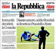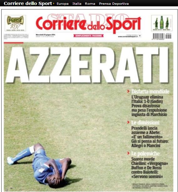 El diario "La Repubblica" también titula sobre el "desastre azzurro" y destaca cómo este resultado ha llevado a la dimisión del seleccionador, Cesare Prandelli, y del presidente de la Liga de fútbol, Giancarlo Abete.