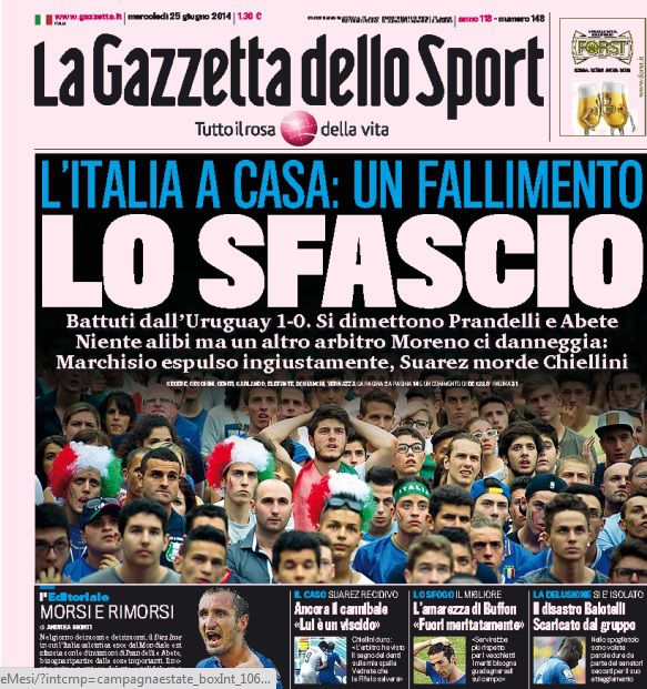 "Un fracaso", "El colapso", son las expresiones elegidas por el diario deportivo "La Gazzetta dello Sport" para definir la eliminación de Italia del Mundial tras perder 1-0 contra Uruguay.