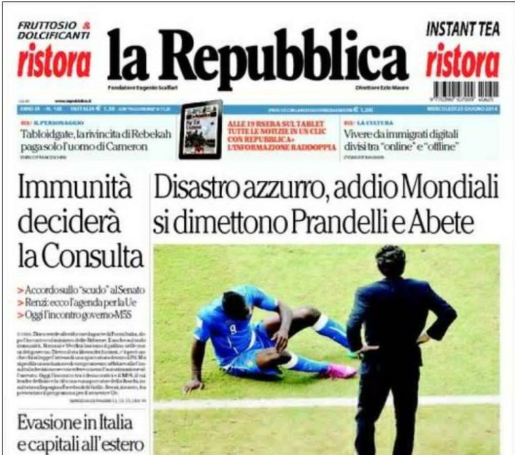 "Lo llaman Drácula", se lee al inicio del artículo dedicado al mordisco de Suárez, aunque "La Repubblica" también dedica sus páginas a la desilusión por la actuación de una de sus estrellas, Mario Balotelli.