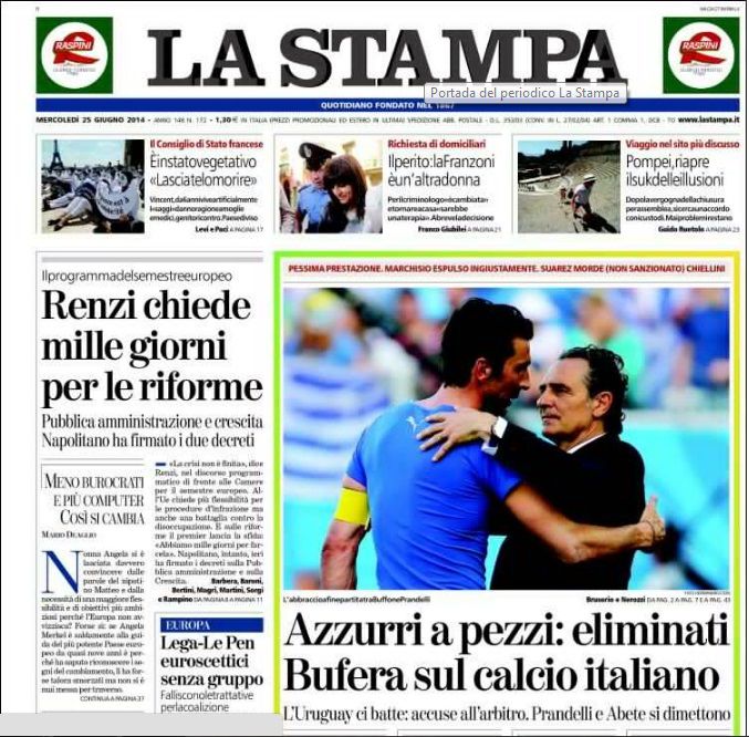 La prensa italiana no busca excusas a lo que considera un "desastre" y un "fracaso" tras la eliminación de la selección de Italia del mundial, pero acusa al árbitro de sus errores durante el encuentro y entre ellos el mordisco del uruguayo Luis Suárez.
