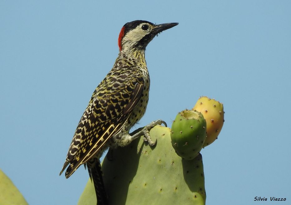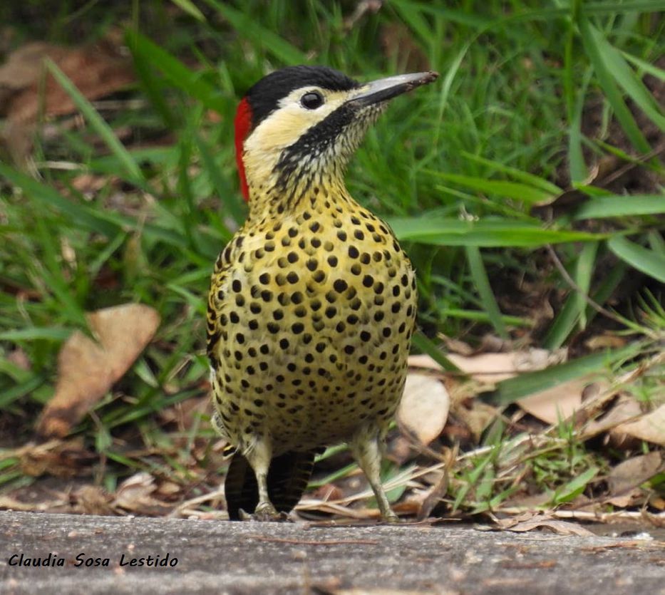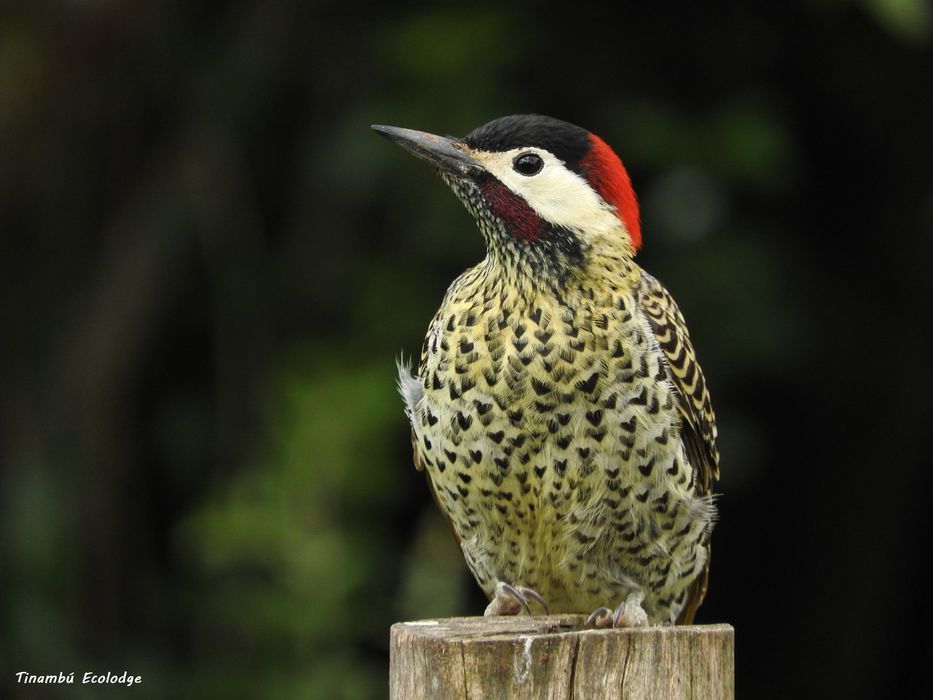 Identificación: ave de 23 cm de longitud. Dorso amarillo-verdoso manchado de negro. Ventral ocráceo con punteado negro. Boina negra y llamativa nuca roja. Lados de la cara blancos desde el pico hasta la nuca. El macho tiene línea malar roja, la de la hembra es negra. Vocalización variada y fuerte.
