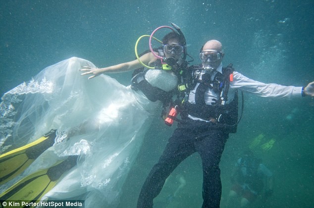 La pareja intercambió anillos en el fondo del océano, se dio el beso de rigor e hizo caso como pudo a los ademanes del juez de la ceremonia, también equipado para la ocasión.