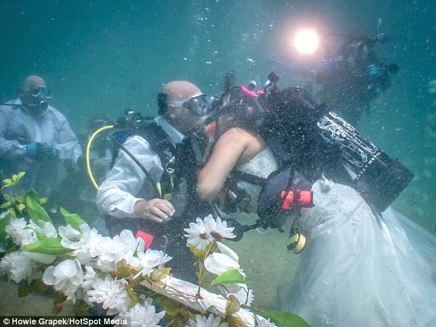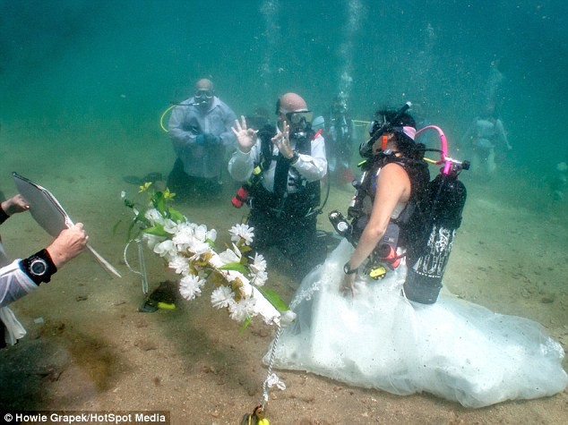 La ceremonia duró 15 minutos, con la presencia de unos 20 invitados usando equipos de buceo e incluso un par de tiburones curiosos pero inofensivos.