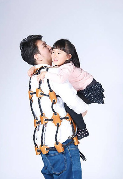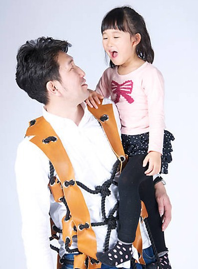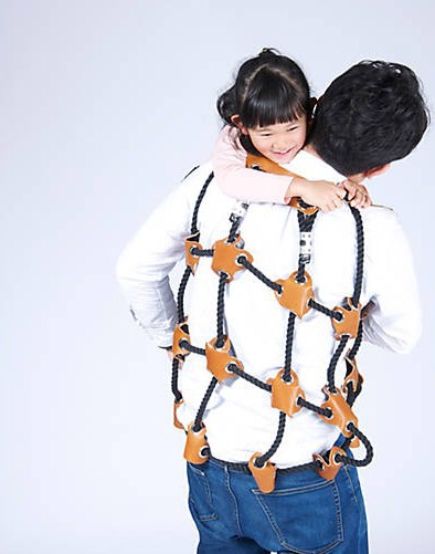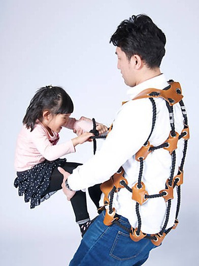 Para que los padres y madres puedan jugar con sus hijos de la forma más versátil posible, Atsushi Shiraishi, profesor de artes en Tokio, diseñó un chaleco que oficia como soporte para que los pequeños escalen "progenitor arriba".