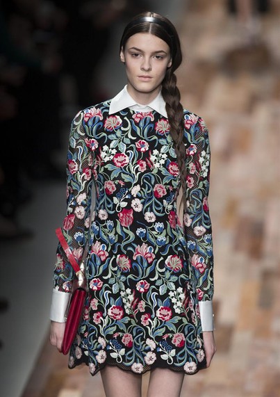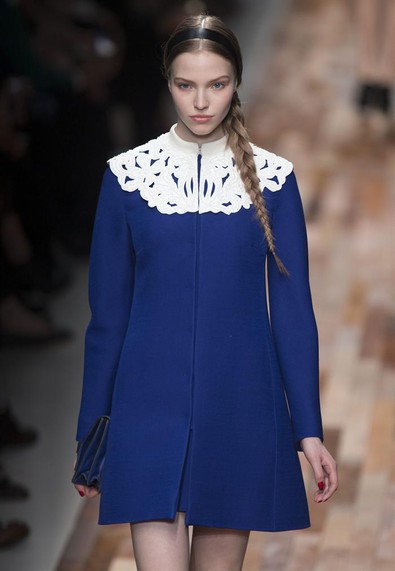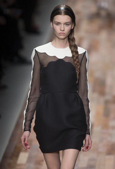 Los vestidos trapecio con cuellos y puños de puntilla blanca abrieron un recital con pieles y terciopelo, rigor cromático, líneas rectas y bordes formados por consecutivas semicircunferencias, transparencias, escotes geométricos y brocados.