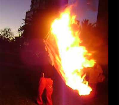 Posteriormente, la decisión de quemar una bandera estadounidense dividió momenáneamente a los manifestantes, ya que algunos consideraban inapropiado realizar tal acto. A pesar de ello, la bandera, mojada con gasolina, fue encendida y ardió con premura.