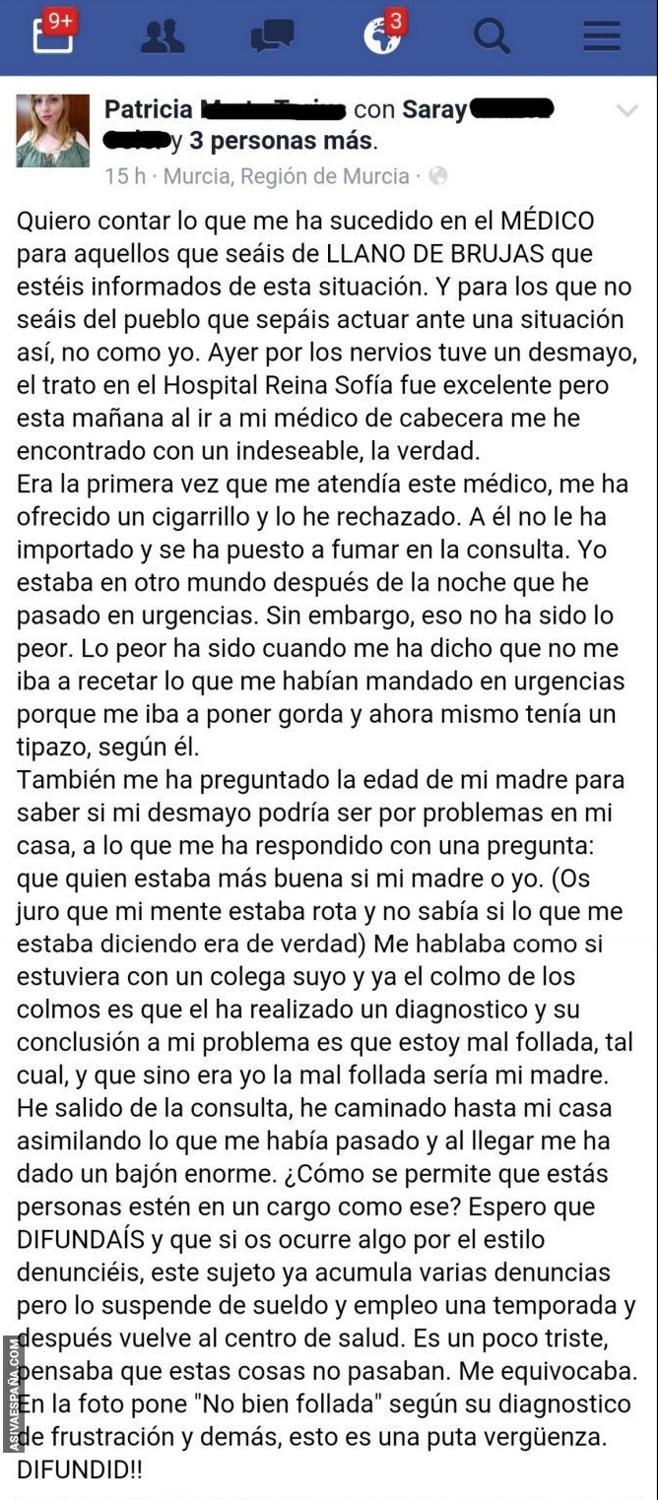 "Os juro que mi mente estaba rota y yo no sabía si lo que me estaba diciendo era de verdad", según explica en su cuenta de Facebook la afectada quien califica al facultativo de "indesable".