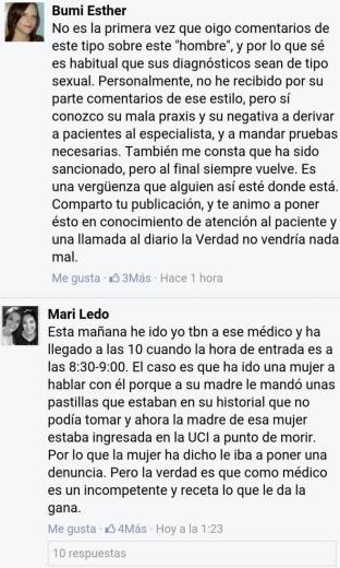 El mensaje generó un revuelo considerable en la red. No tardó en expandirse y en acoger diferentes opiniones. También dos usuarias de Facebook desvelaron haber vivido u oído una situación similar al respecto del médico.