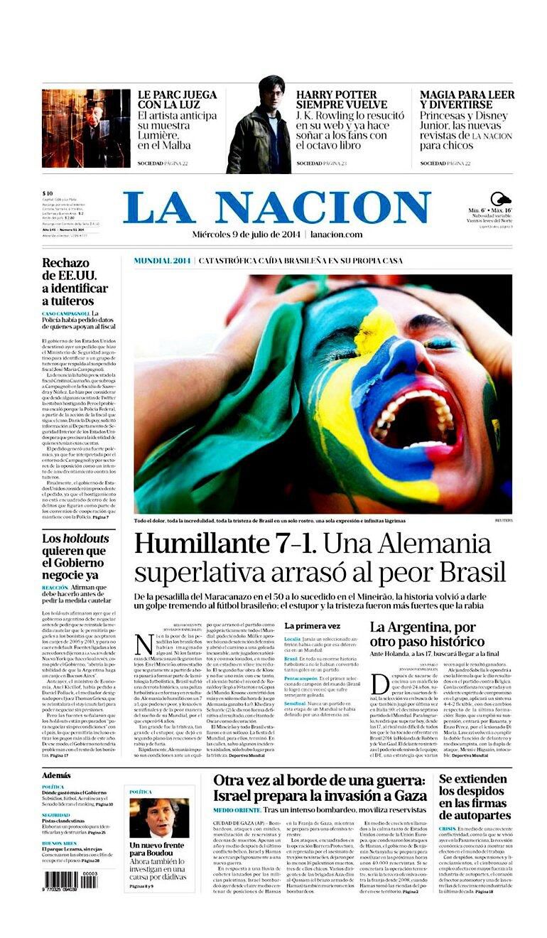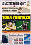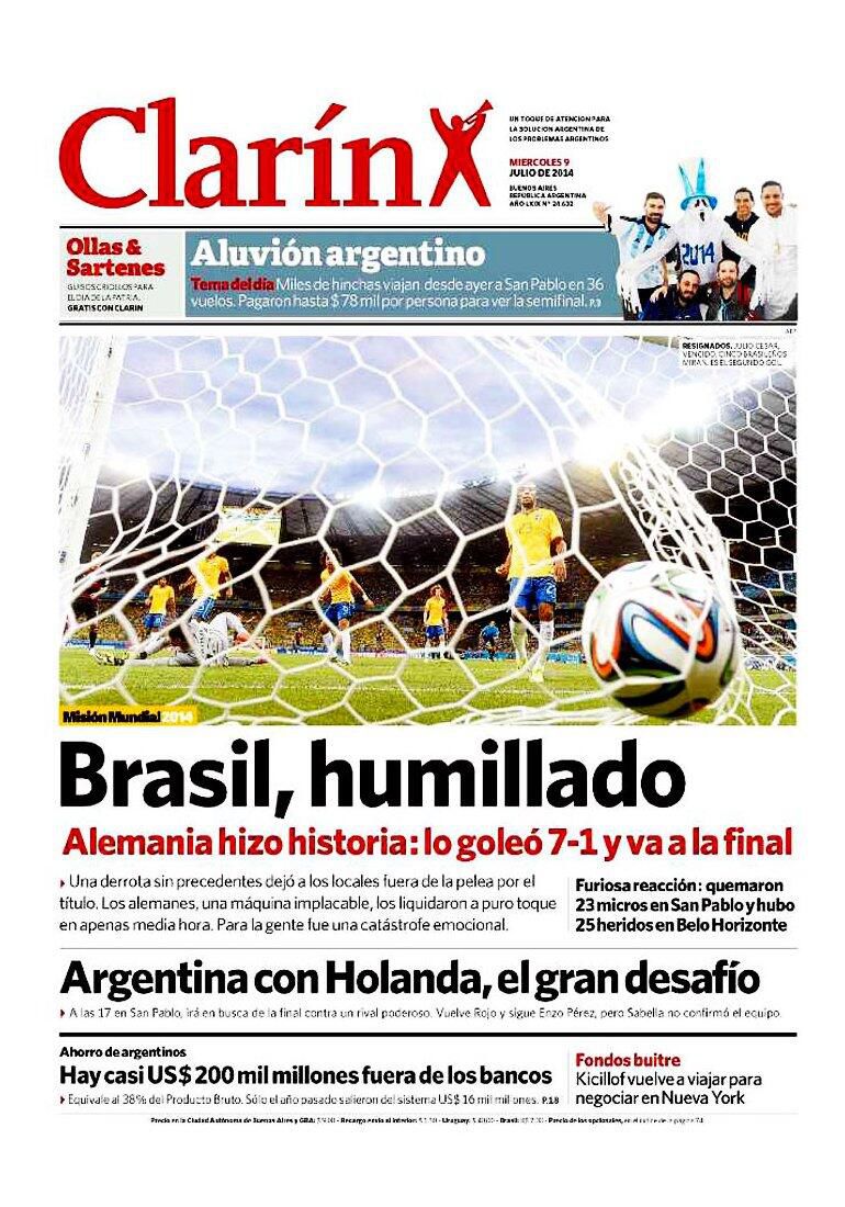 El 7-1 de Alemania sobre Brasil se adueñó de todas las portadas del mundo. El día después de la humillación sufrida por los dirigidos por Luiz Felipe Scolari mostró la dureza esperada de parte de los medios locales, así como también el disfrute de los argentinos y la sorpresa del resto.