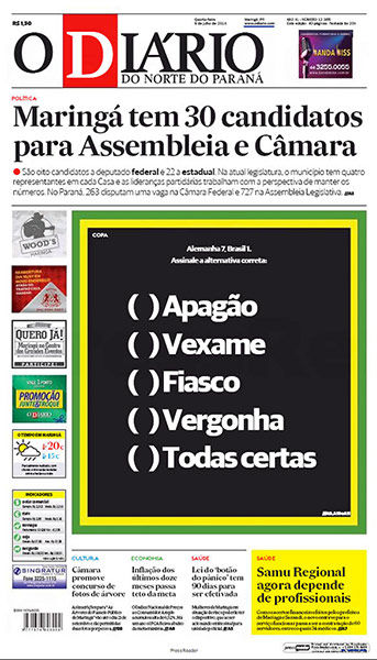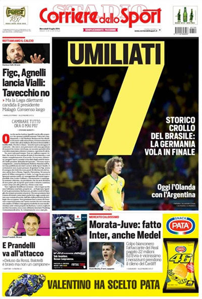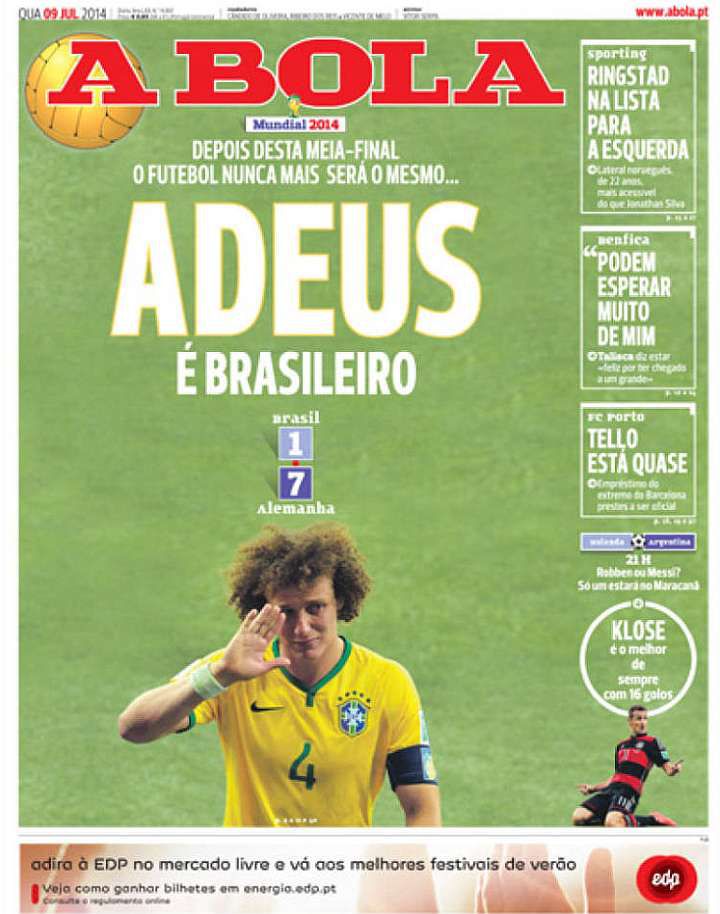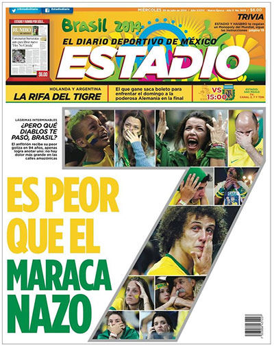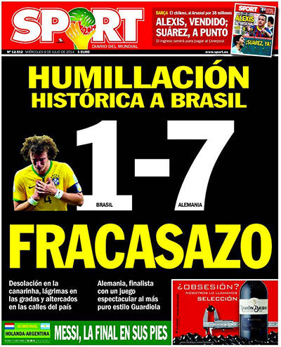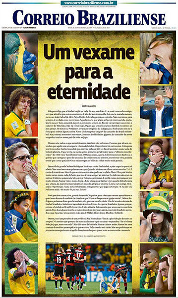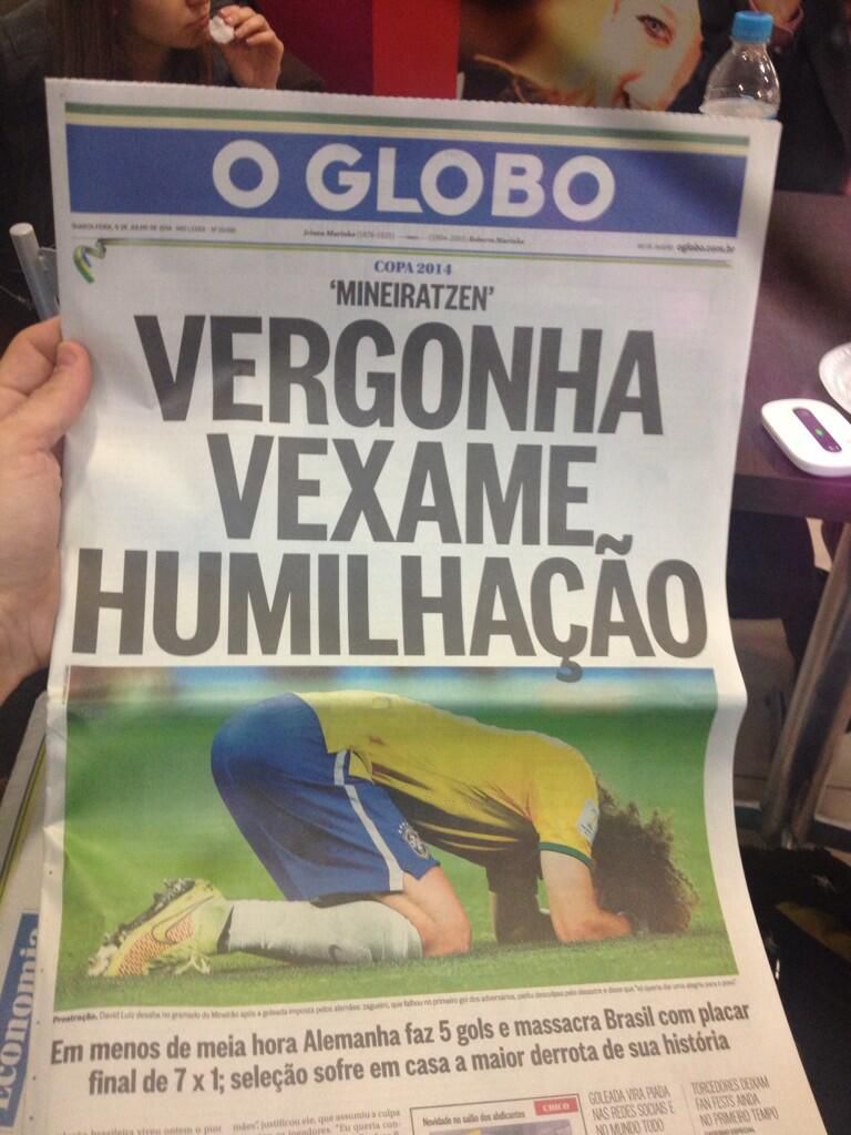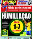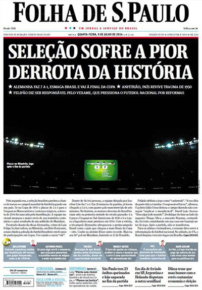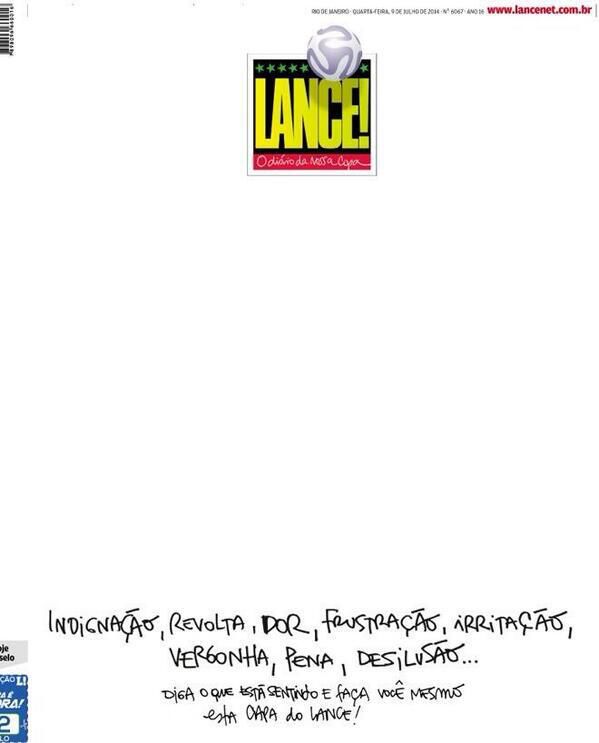 Los propios brasileños reflejaron la indignación generada por el resultado, y tuvieron tapas negras, como la del diario Metro, emulando la recordada tapa de El Gráfico de Argentina después del 0-5 sufrido con Colombia en 1993, y también una tapa blanca, la de Lance, que dejó el espacio central para que los hinchas escribieran lo que sienten después del histórico 1-7.