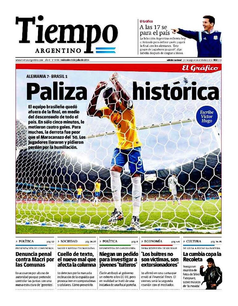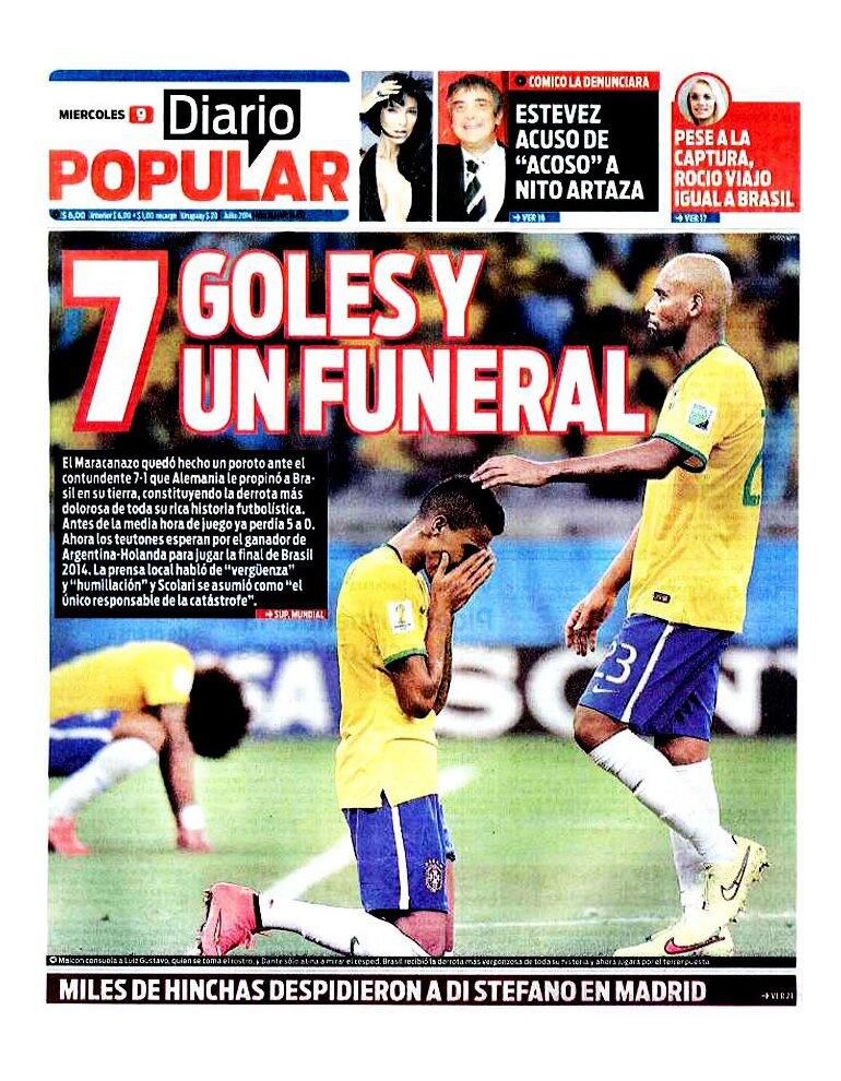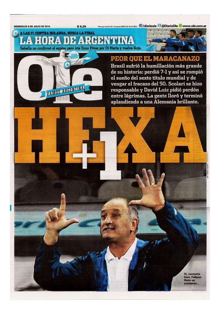 También gozaron de la eliminación brasileña los argentinos, y entre los más creativos, como de costumbre, estuvo el diario Olé, que colocó una foto de Scolari con siete dedos en alto y el título “Hexa+1”. “7 goles y un funeral”, fue la frase elegida por Diario Popular, mientras que en el resto del mundo hubo sorpresa.