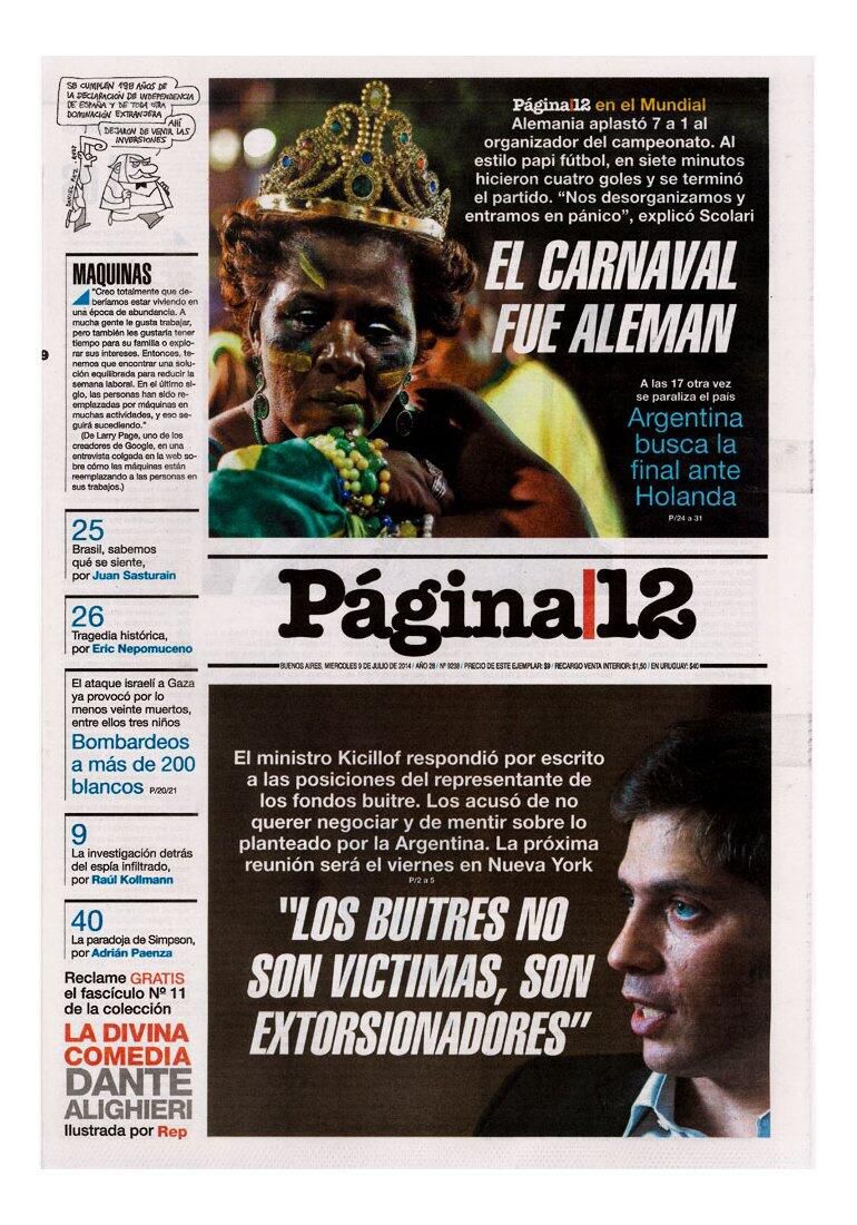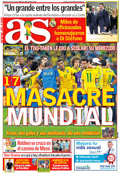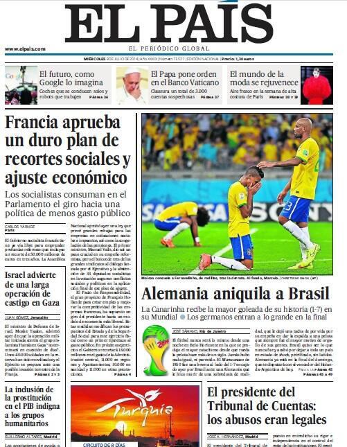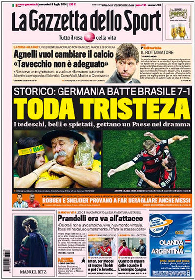 Los diarios más importantes del mundo se hicieron eco del 7-1 de Alemania sobre Brasil. Los norteños pasaron de tapas negras a blancas, y los argentinos se mofaron de la humillación verdeamarela. “Sin vaselina”, tituló el mismo medio colombiano que había insultado al juez del partido de su eliminación.
