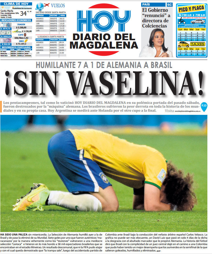 Una de las primeras tapas que buscó este medio fue la del diario Hoy de Magdalena, Colombia, la misma que había generado polémica el sábado pasado por insultar sin tapujos al árbitro español Velasco Carballo después de la eliminación cafetera a manos de los anfitriones. Y como era de esperarse, se mofaron de Brasil: “Sin vaselina”, puede leerse en el título, sobre una foto donde aparece David Luiz arrodillado sobre el césped.