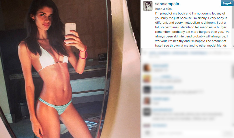 "La cantidad de críticas que recibo y que veo hacia otras amigas modelos que sé que son naturalmente delgadas son ridículas. Ustedes no nos ven avergonzando a otros por su tipo de cuerpo así que por favor no nos avergüencen a nosotras", sentenció Sampaio.