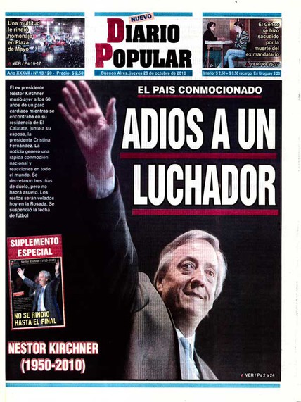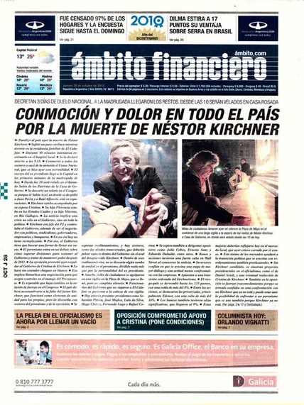 "Conmoción general por la muerte de Néstor Kirchner", tituló el diario La Capital de Rosario, la tercera ciudad del país.