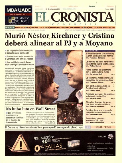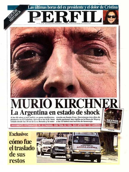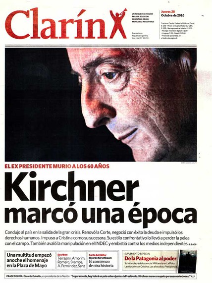 "Kirchner, marcó una época", tituló el diario Clarín, enfrentado al gobierno, en una tapa ilustrada por un poco amable primer plano del perfil del esposo de la presidenta Cristina Kirchner, según AFP.