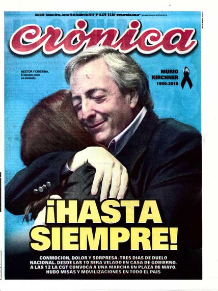 "Hasta siempre", coincidieron en titular los diarios Crónica y Tiempo Argentino, al sumarse el jueves a la conmoción que invade a los argentinos por la súbita muerte del ex presidente Néstor Kirchner (2003/2007).