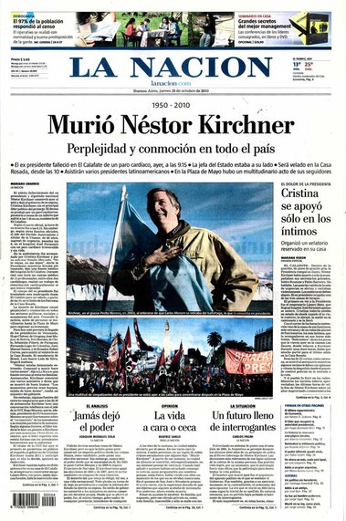 "Murió Néstor Kirchner. Perplejidad y conmoción en todo el país", señaló el diario La Nación, crítico del gobierno, junto a una foto del ex mandatario abrazando una bandera de Argentina frente a un glaciar, paisaje de su Patagonia natal.