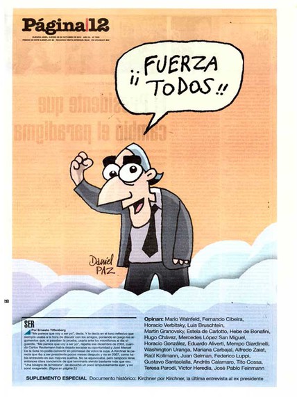 El diario Página/12 eligió para su primera plana una caricatura del secretario general de la Unasur, firmada por el dibujante Rep, en la que como un personaje de historieta saluda y alienta desde el cielo con un "¡Fuerza todos!".