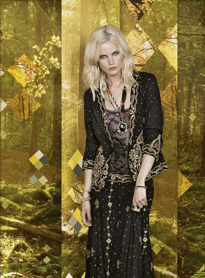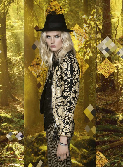 Como complemento de la colección, el denim se presenta con acabados brillantes símil cuero, estampas espigadas, ikats geométricos y terciopelos metálicos que evocan al glam rock.