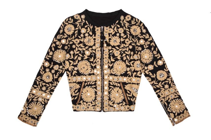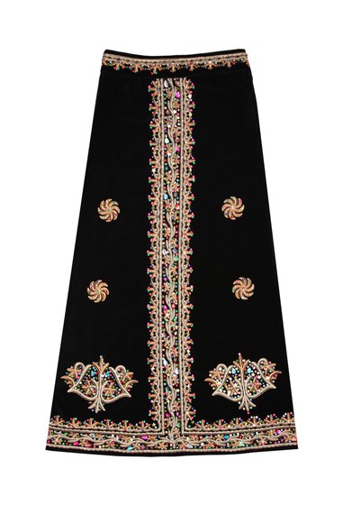 Los bordados aparecen en las piezas emblemáticas de la colección: sacos, maxi faldas y buzos en terciopelo se cubren de oro y pigmentos naturales, labores tradicionalmente realizados a mano.