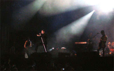 José María Sanz Beltrán “Loquillo”, comenzó su recital atacando algunos temas “nuevos” entiéndase por nuevos los “post '90”, como “Arte y Ensayo”, “Cruzando el paraíso”, o “Actitud rocanrol”. A lo largo del show, el hombre tuvo ocasión para fumase su cigarrito, peinarse, mandarse su copita de champán, y regalar al público sus ademanes habituales, brazo e indice extendido, posturas estatuarias e incluso patadas voladoras. Es que no puede negarse que el tipo tiene más tablas que un libro de matemáticas, que es un bicho de escenario y un verdadero profesional, además de un gran cantante. Sin embargo, la mecha no se encendió hasta que sonaron las primeras notas del primer clásico de la noche: “Rock suave”, que despertó como por ensalmo a todos los que habíamos llegado ahí sabiendo que, en un repertorio surtidito, tendríamos la suerte de agitar con algunos de esos oldies entrañables.
