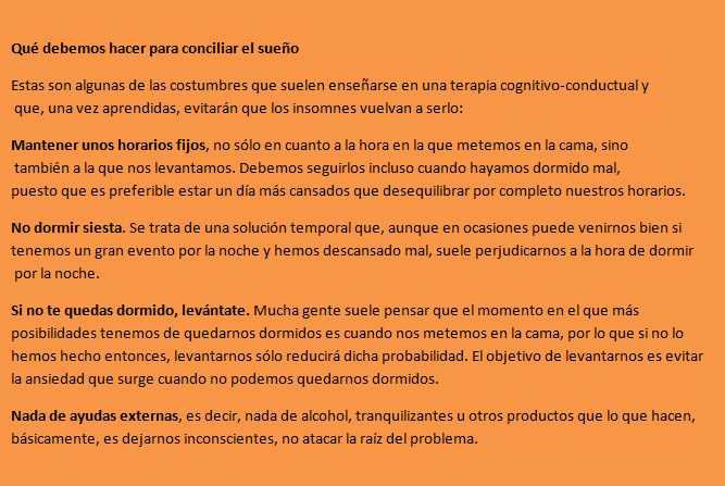 Hay, no obstante, alternativas que nos permiten descansar mejor sin tener que tomar ningún producto. Es el caso de la terapia cognitivo conductual, recomendada, entre otras, por la Academia Americana del Sueño como una buena herramienta para aquellos que sufren insomnio crónico. En muchos casos se necesita la intervención de un profesional para dirigir el tratamiento, pero el doctor Seth J. Gillihan, de la Universidad de Pensilvania, resumió los puntos claves en un artículo publicado en Psychology Today , según informa El Confidencial.