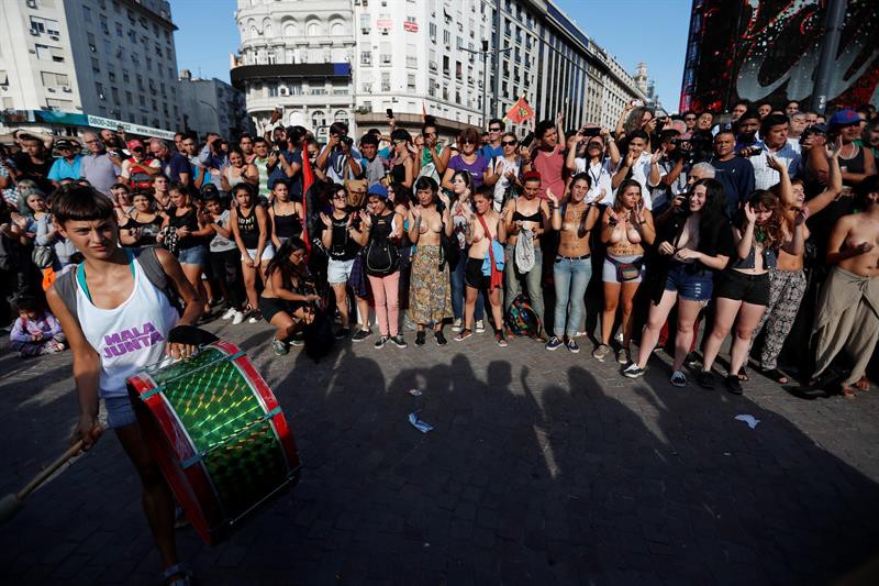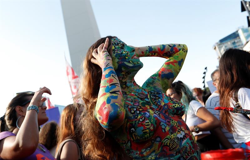 El "tetazo" celebrado el martes en el emblemático Obelisco de Buenos Aires reunió a casi 1.000 personas, cifra dividida entre los hombres que miraban y las manifestantes, de las que en torno a cien enseñaron sus pechos pintados para protestar en contra de la cosificación del cuerpo de la mujer.