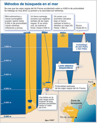 La búsqueda en la región del accidente está a cargo de tres navíos de la Marina, que ha enviado un total de cinco barcos al área, y de diez aeronaves de Brasil, Francia, España y Estados Unidos que patrullan el Atlántico.