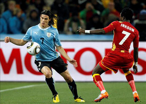 Para el complemento, Tabárez dio ingreso a Nicolás Lodeiro en lugar de Álvaro Fernández, quien perdió el mano a mano con Muntari por su costado. De arranque, el árbitro OlegariO Benquerença omitió una clara falta sobre Cavani cuando el delantero (hoy devenido a volante) se metía en el área.