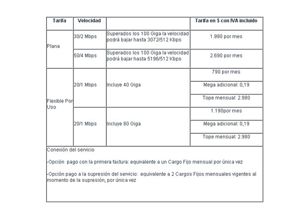 En efecto, se establecen dos tipos de Tarifas Planas, una para la conexión de 30/2 Mbps, con un costo de $ 1.990 por mes y otra para una conexión de 50/4 Mbps, con un costo mensual de $ 2.690.
