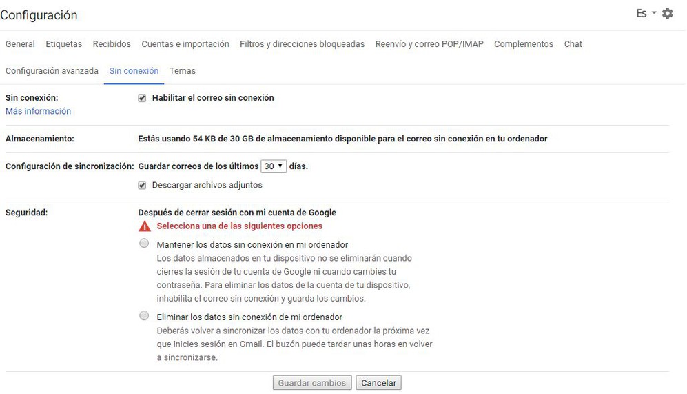 Una vez habilitado, hay que acceder nuevamente a la configuración, ingresar en la pestaña "Sin conexión" y marcar la opción "Habilitar el correo sin conexión". Entonces, se puede seleccionar el lapso por el que almacenar correo mientras se está fuera de línea.
