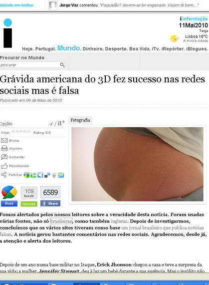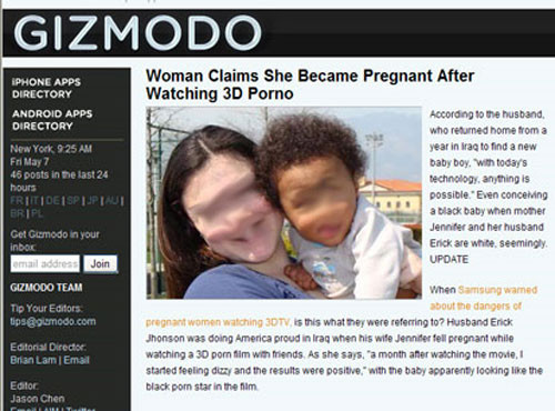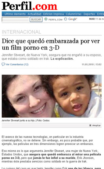 El portal brasileño Sensacionalista publicó, días atrás, una nota en la que informaba que Jennifer Stweart, de 38 años, y esposa del soldado Erick Jhonson, destacado en Irak, quedó encinta tras ver una película porno en 3D. El artículo bromea sobre los alcances de la nueva tecnología, y reproducía las "declaraciones" del ahora padre: "no veo por qué desconfiar de ella", dijo Jhonson, un hombre blanco casado con una mujer blanca que dio a luz un niño negro. "Las películas 3D son muy reales. Con la tecnología de hoy todo es posible".