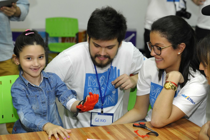 Junto a Gino, más de 100 voluntarios de Medicina Personalizada, Fundación Telefónica - Movistar y Microsoft construyeron, acompañados por el portador de la prótesis y su familia, la mano que se entregó al finalizar la jornada. Los beneficiarios ya habían cargado la información necesaria en la web del proyecto: www.manoton.org.